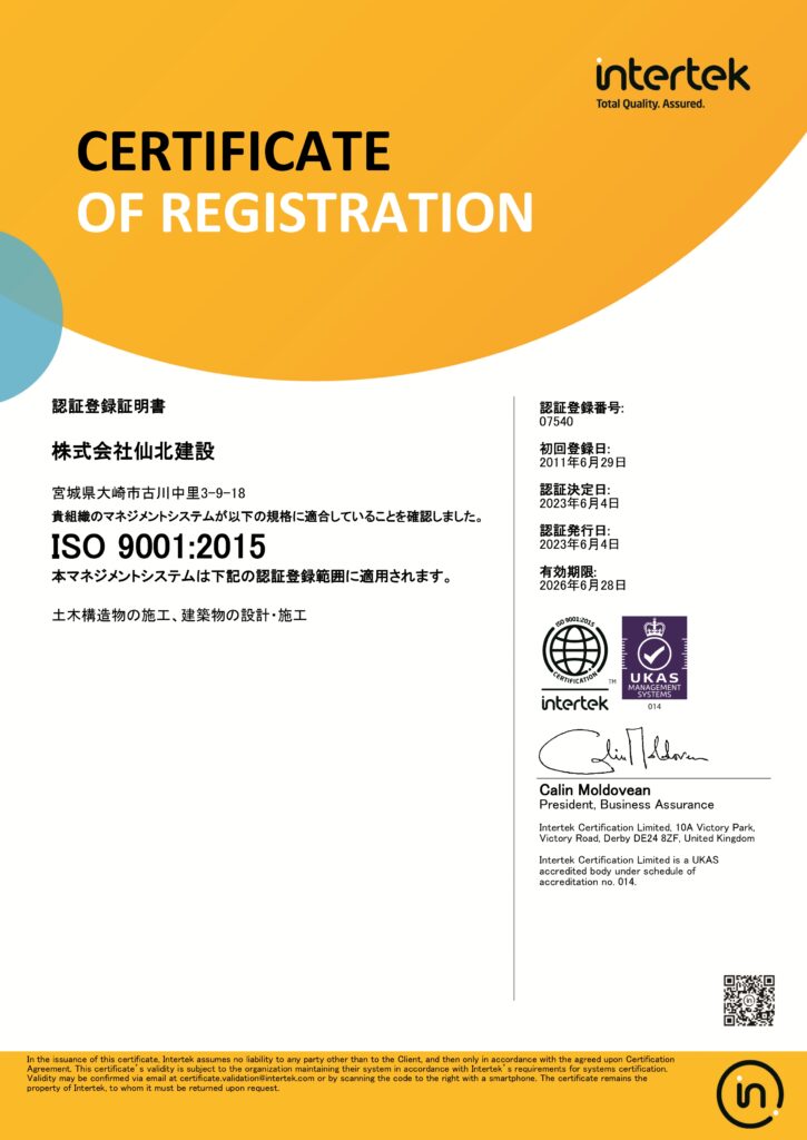 平成23年06月 ISO9001:2008 認証登録(土木構造物の施工、建築物の設計・施工)